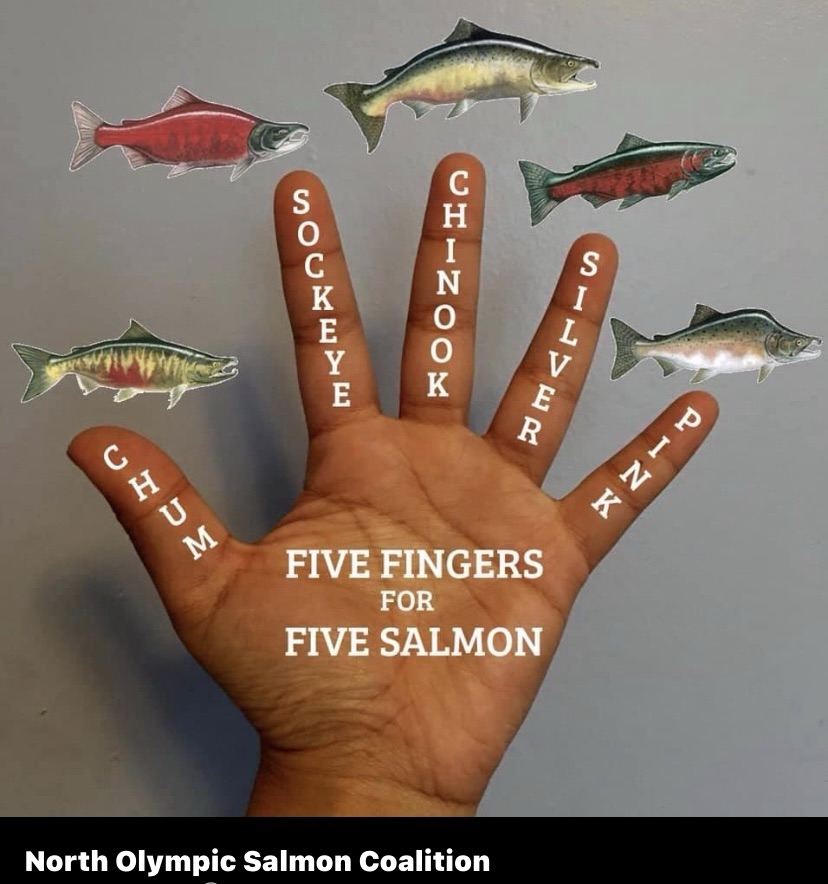 The five species of salmon include chum, sockeye, king, silver, and pink. A neat way to remember them is to spread your hand out and look at your fingers. Chum rhymes with thumb. Sockeye Salmon is the pointer finger which is usually the one you poke yourself in the eye with. The middle finger is the biggest and represents king salmon. You wear silver on your ring finger, hence silver salmon, and pinky is for pink.